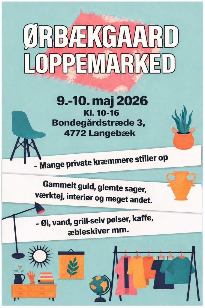 Ørbækgaard Loppemarked Bondegårdstræde 3, Langebæk 9-10 maj 2026 Lørdag-søndag kl 10-16 Det hyggeligste loppemarked med grill-selv pølser, øl/vand, kaffe/kage og nybagte æbleskiver. Gamle kendinge og mange nye sætter ting til salg - kom og gør en god handel