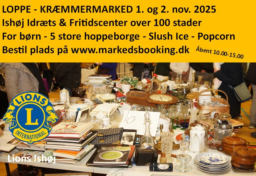 ![]() Stande bestilles til lørdag d.1. og søndag d.2. november. Der er mulighed for at leje bord (2 meter) og stol. Der kan stilles op fredag d. 31. oktober fra kl 17 til kl 19 eller lørdag fra kl. 7:30. Det er vigtigt at der ikke lukkes før søndag kl. 15. Spørgsmål kan sendes til lopper@karlslundefodbold.dk. […] ![]() Støt op om merløse fodbold og lej et bord på 1x2m hvor du kan sælge dine brugte ting og tøj.(medbring selv tøjstativ). Åbningstid er begge dage kl 10-14. der kan stilles op fra kl 8 lørdag morgen, alle skal være klar kl 9.45. Ingen pakker ned før kl 14. Alt skrald skal tages med. Der […] ![]() Ishøj Fritids & Idrætscenter danner igen rammen om markedet. VI håber, at kræmmere og publikum vil slutte op om markedet, så vi kan få et par dage med god handel og godt humør. For børnene vil hoppeborgene igen være til rådighed. Der er åbent for publikum begge dage kl. 10.00 til kl. 15.00. Overskuddet fra […] ![]() Oplev Vestegnens store Kræmmer og Loppemarked Sted: Brøndby Stadion 10 2605 Brøndby Dato: 1-2 November 2025. Oplev: Kræmmere fra hele landet Den rigtige markedsstemning Nogle af Danmarks mest erfarne og bedste kræmmere 200 kræmmerstande fylder hallen op med stande, så der bliver virkelig et kæmpe udvalg at kigge på. Man kan både købe nyt og […]